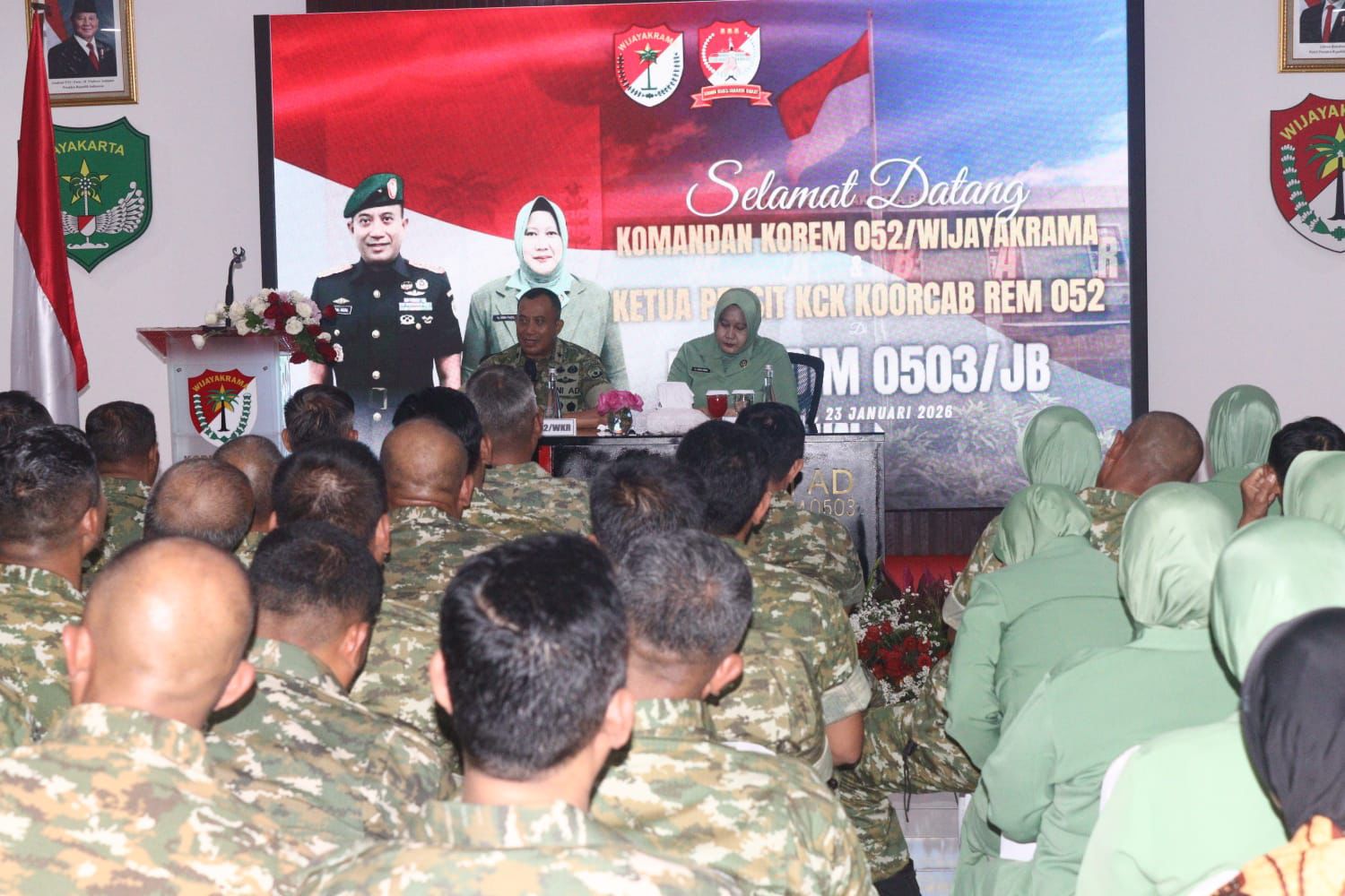 Komandan Korem 052/Wijayakrama Brigjen TNI Faisal Rizal, S.IP., bersama Ketua Persit Kartika Chandra Kirana Koorcab Rem 052 PD Jaya melaksanakan kunjungan kerja ke Kodim 0503/Jakarta Barat yang berlokasi di Jl. Letjen S. Parman No. 3, Kelurahan Tomang, Kecamatan Grogol Petamburan, Kota Jakarta Barat, Jumat (23/1/2026).