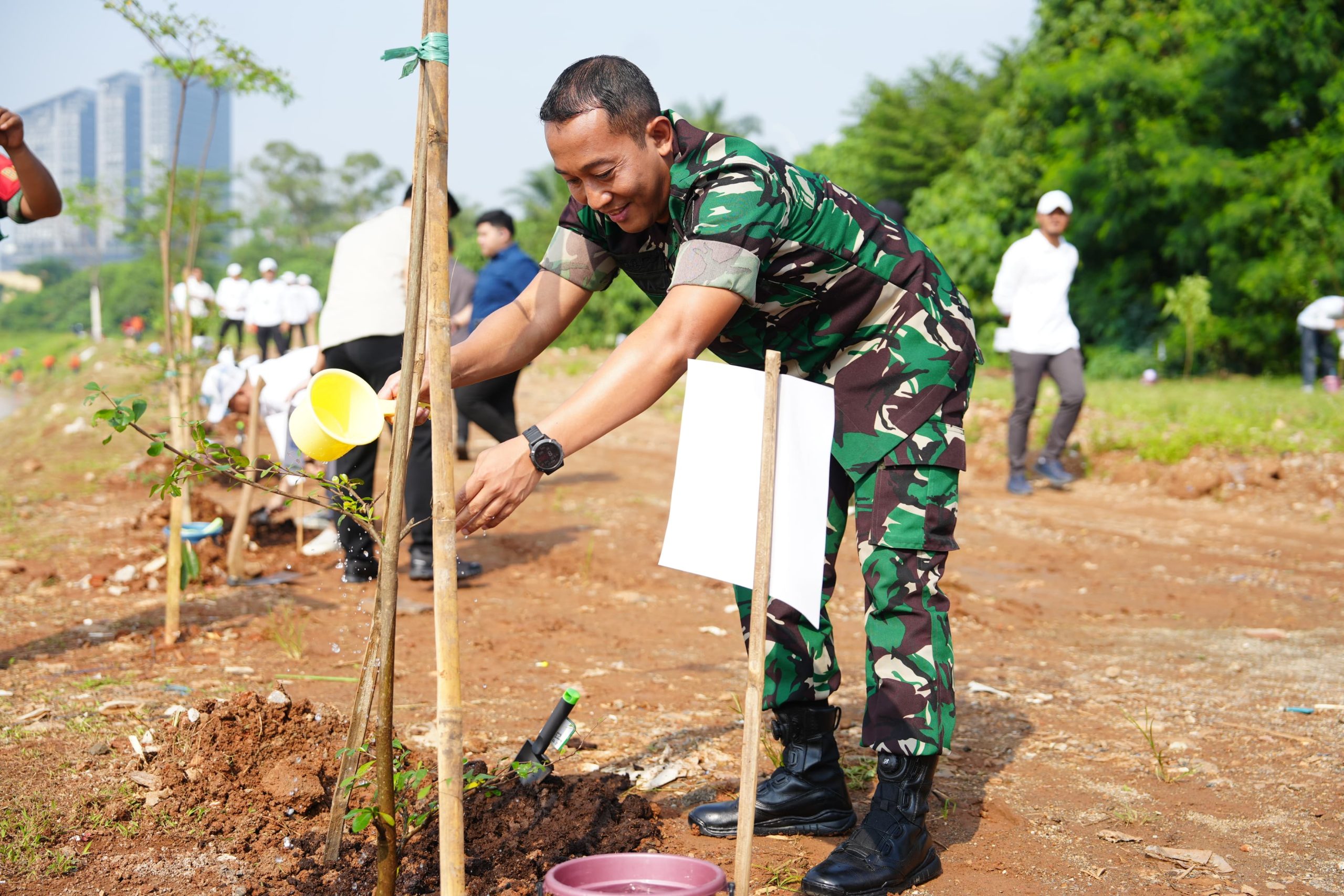 Kasiter Kasrem 052/Wijayakrama, Kolonel Arh Tamaji, S.Sos., M.I.Pol., mewakili Danrem 052/Wkr menghadiri kegiatan penanaman 1.000 pohon dalam rangka memperingati Hari Bumi 2026 yang dilaksanakan di kawasan Situ Cihuni, Desa Cihuni, Kecamatan Pagedangan, Kabupaten Tangerang. Rabu (22/4/2026).