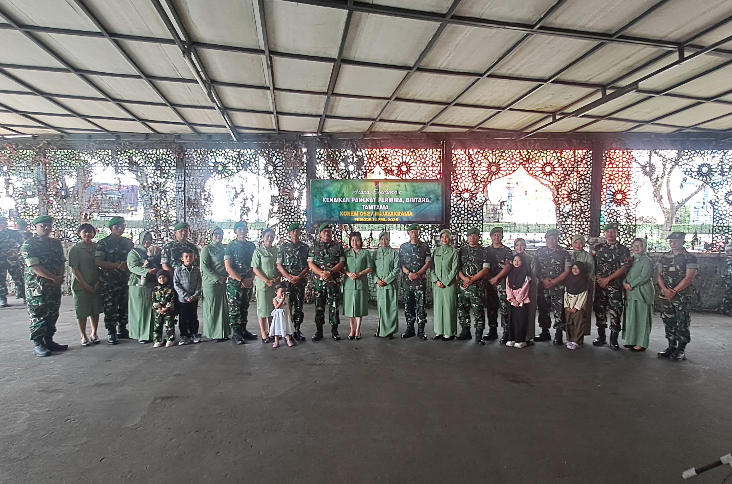 Acara pelantikan berlangsung khidmat ditandai dengan penyematan tanda pangkat baru kepada perwakilan prajurit oleh Kasrem 052/Wkr. Setelah itu dilanjutkan acara syukuran. Kegiatan ini turut dihadiri para Kasi Korem, Wakil Ketua Persit Kartika Chandra Kirana Koorcab Rem 052 PD Jaya beserta Pengurus, para Perwira, Bintara, Tamtama, Prajurit yang naik pangkat beserta istri, serta PNS Makorem 052/Wkr.