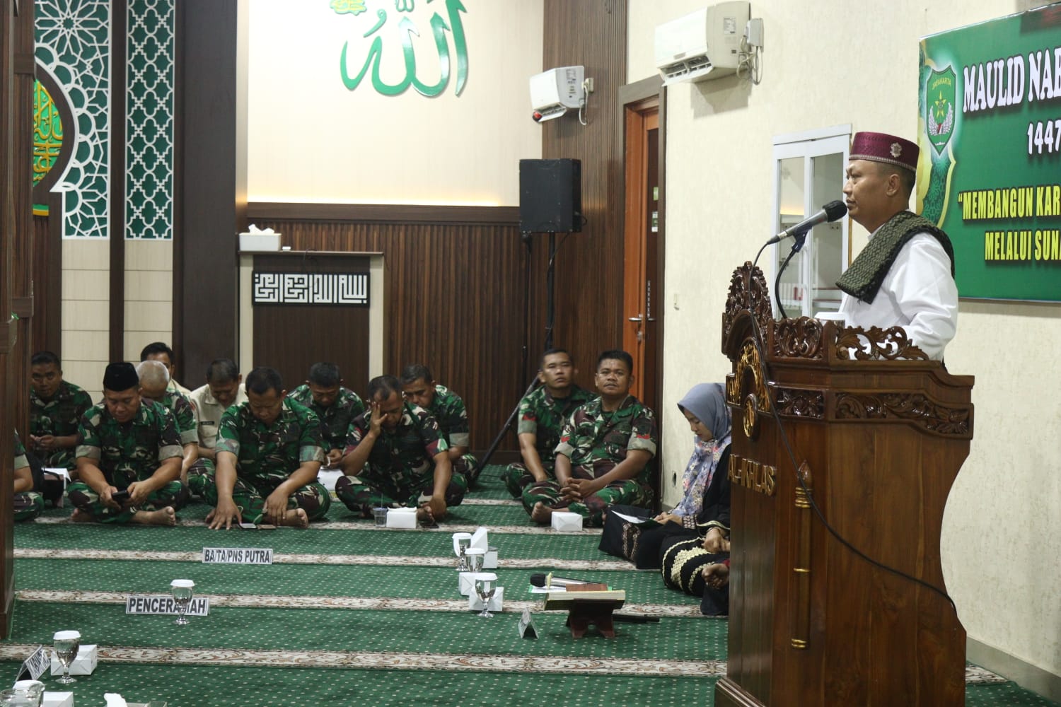 Sedangkan dalam ceramahnya, Ustadz Serka H. Sobirin mengajak seluruh hadirin untuk meneladani sifat-sifat Rasulullah, seperti kejujuran, disiplin, amanah, dan kepemimpinan yang adil. Sifat-sifat ini sangat relevan dan fundamental bagi setiap personel TNI dan PNS dalam membangun karakter prima yang profesional dan berintegritas.