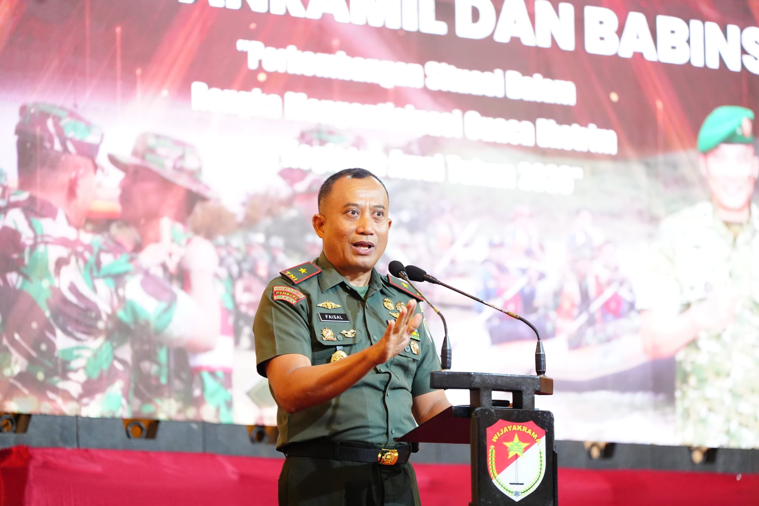 Komandan Korem 052/Wijayakrama Brigjen TNI Faisal Rizal, S.I.P., memberikan arahan, motivasi, serta penguatan tugas pokok kepada para Danramil, Batuud dan Babinsa jajaran Korem 052/Wkr pada Apel Danramil dan Babinsa di Aula Islamic Village, Karawaci. Tangerang (8/01/2026).