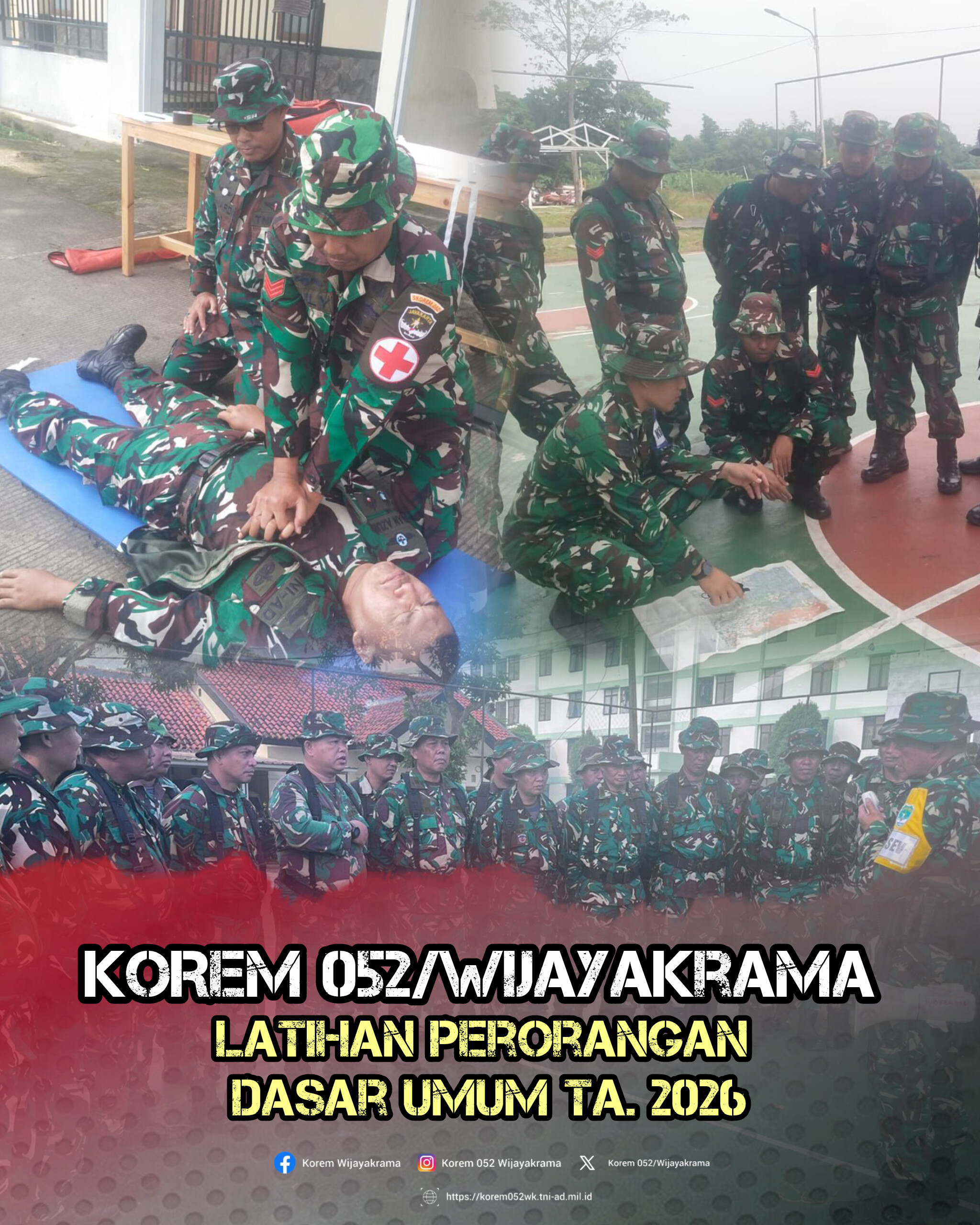 Dalam rangka meningkatkan profesionalisme dan kesiapsiagaan prajurit, Makorem 052/Wijayakrama menggelar Latihan Perorangan Dasar Umum (Latorsar Umum) Tahun Anggaran 2026 pada 10 sampai 11 Februari 2026. Kegiatan berlangsung di Komplek Rumah Dinas (Rumdis) Korem 052/Wkr, Legok, Kabupaten Tangerang.
