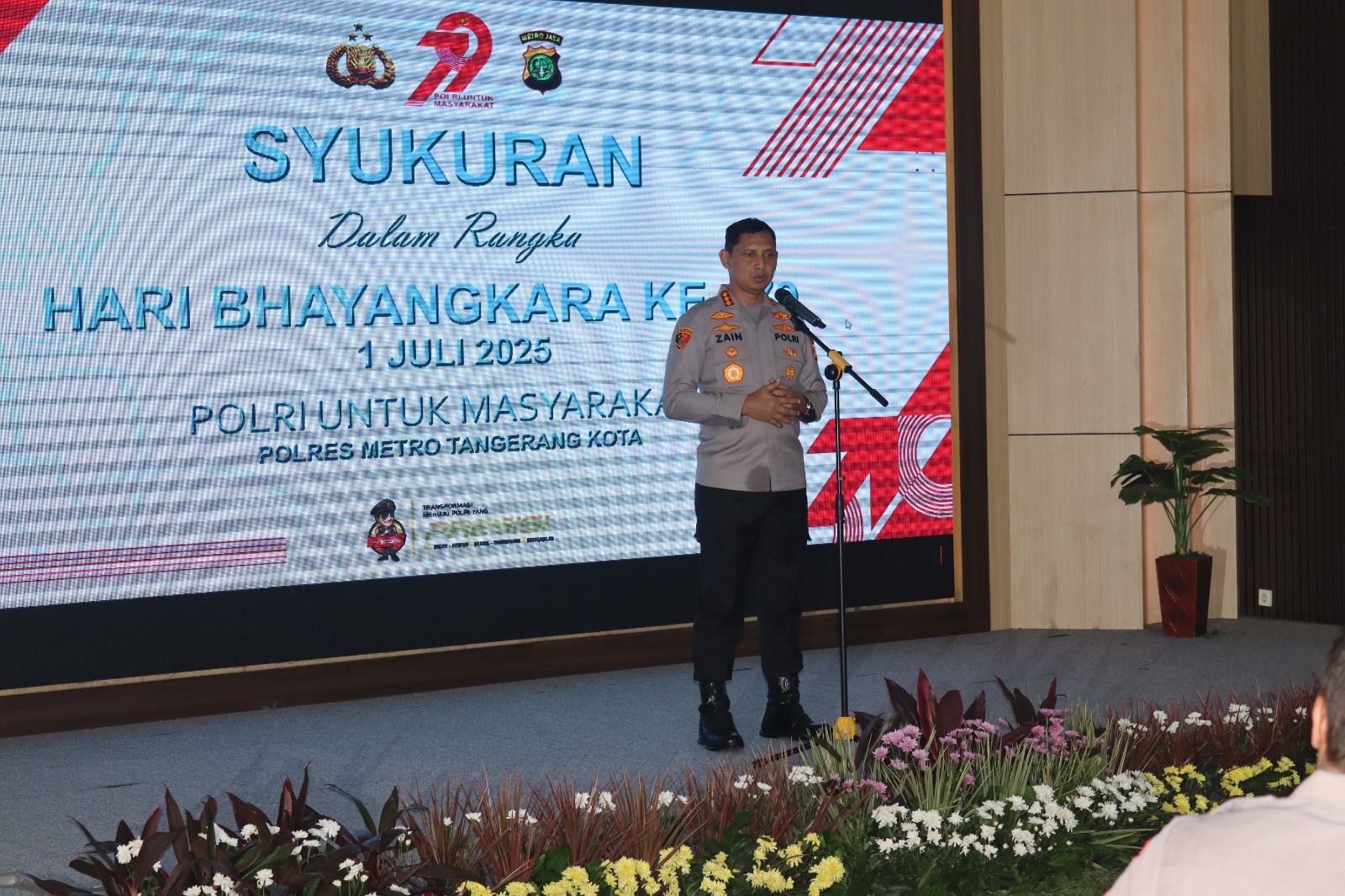 Danrem 052/Wijayakrama, Brigjen TNI Zulhadrie S.Mara,M.Han., menghadiri acara syukuran peringatan Hari Bhayangkara ke-79 tahun 2025 yang diselenggarakan di Polres Metro Tangerang Kota, Jalan Perintis Kemerdekaan, Kota Tangerang. Rabu (2/7/2025).