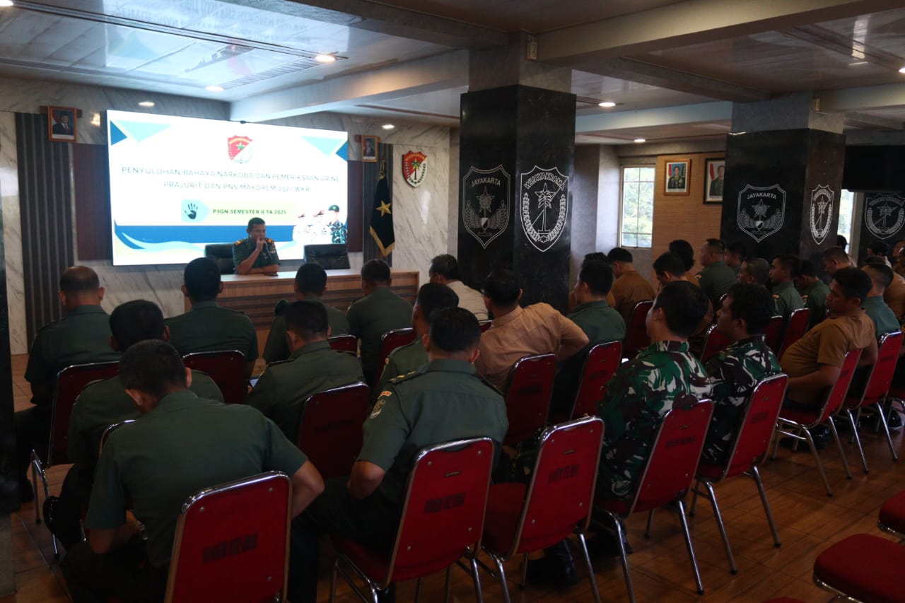 Prajurit dan PNS Makorem 052/Wijayakrama mengikuti kegiatan Sosialisasi Pencegahan, Pemberantasan, Penyalahgunaan, dan Peredaran Gelap Narkotika (P4GN) Semester II TA 2025 yang diselenggarakan oleh Seksi Intelijen Korem 052/Wkr, bertempat di Aula Sudirman, Makorem 052/Wkr, Kelapa Dua, Kabupaten Tangerang, Selasa (25/11/2025).
